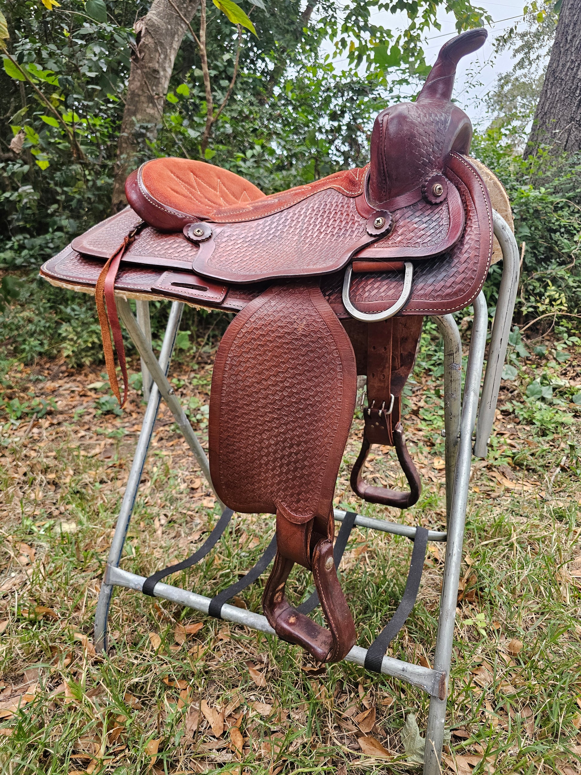 Used 15" Dr J Pony Saddle, 6" Gullet, in good condition, basketweave tooled, suede seat for better grip