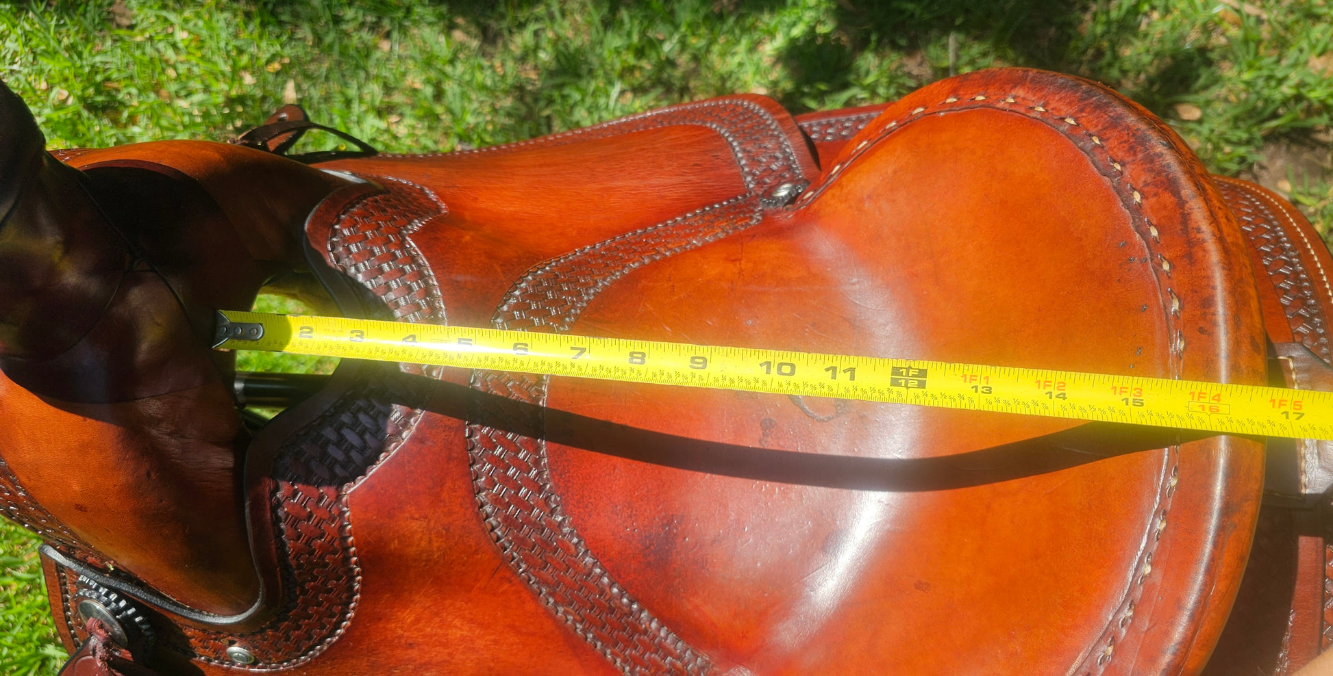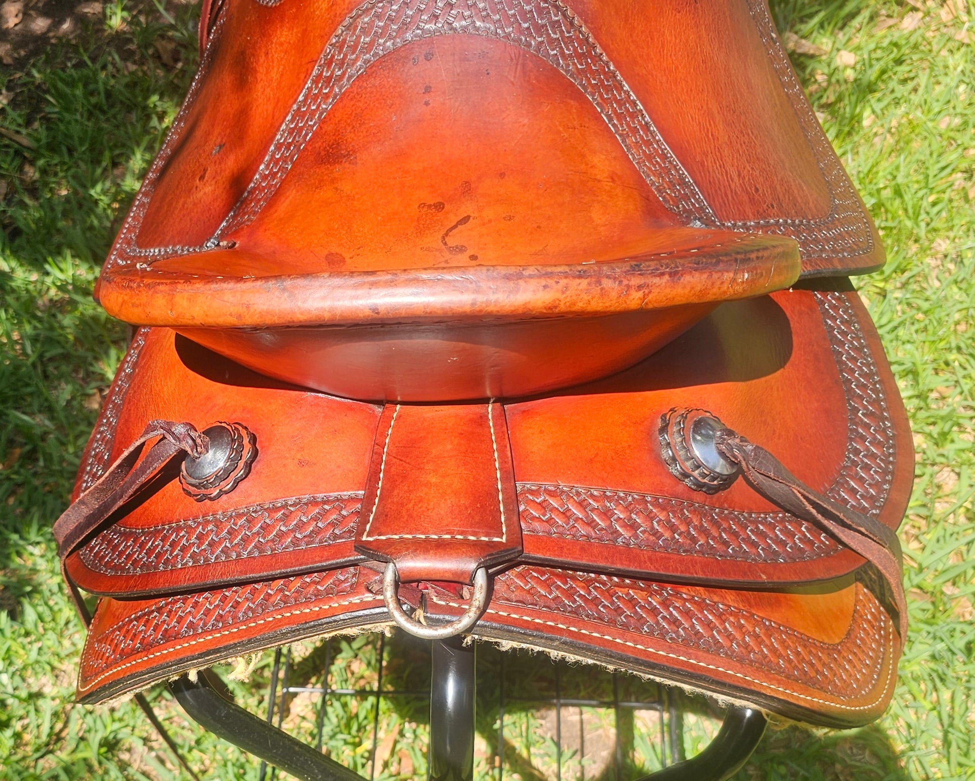 Rare 16" B&B Saddlery, Pagosa Springs, CO Wade Ranch/Trail Saddle in excellent condition aside from cosmetic blemishes on the seat. Handmade by Master Saddler Bob Beecher 7" Gullet, FQHB, Basketweave tooled, nice deep seat! Will come with different stirrups than pictured