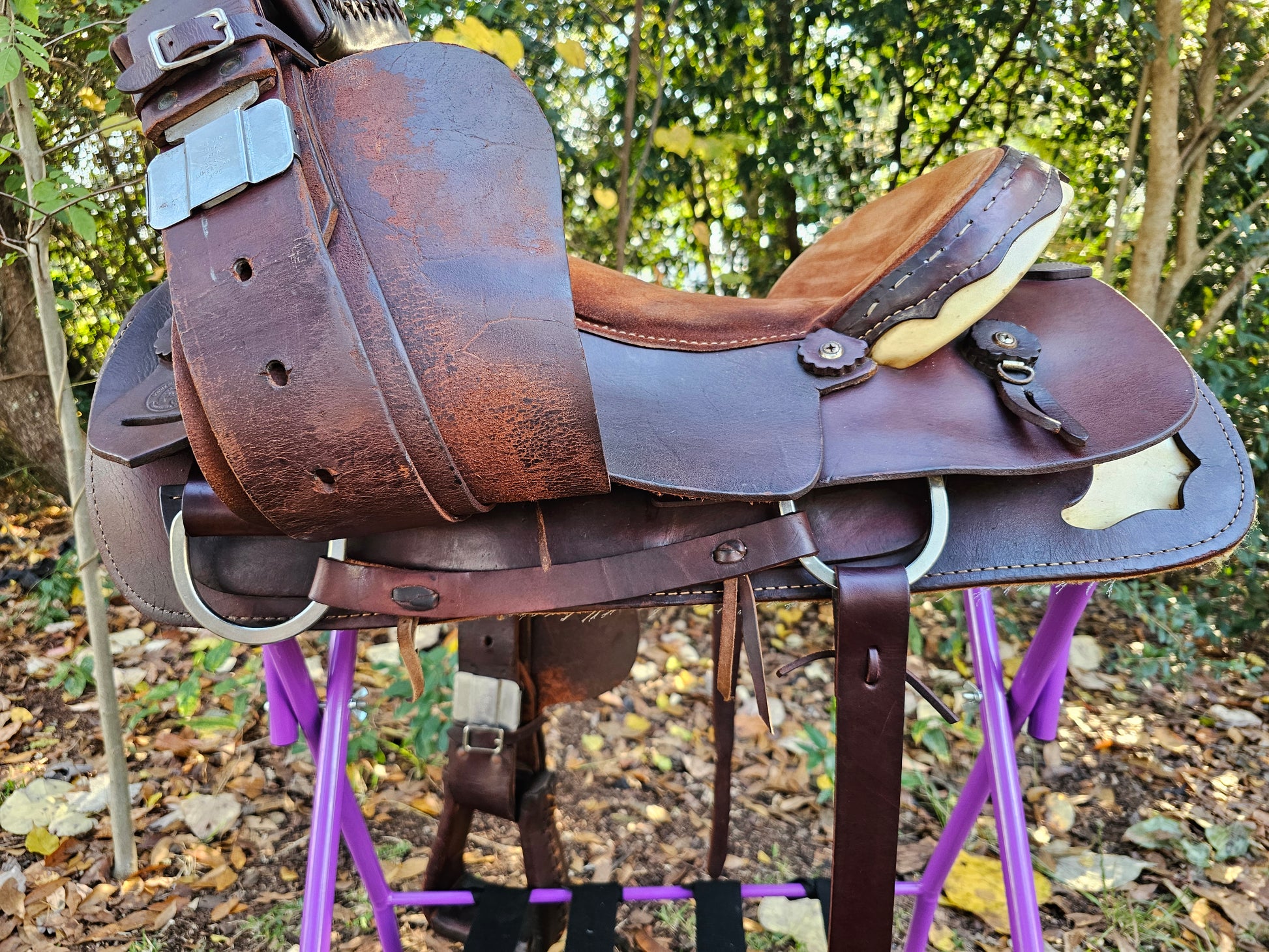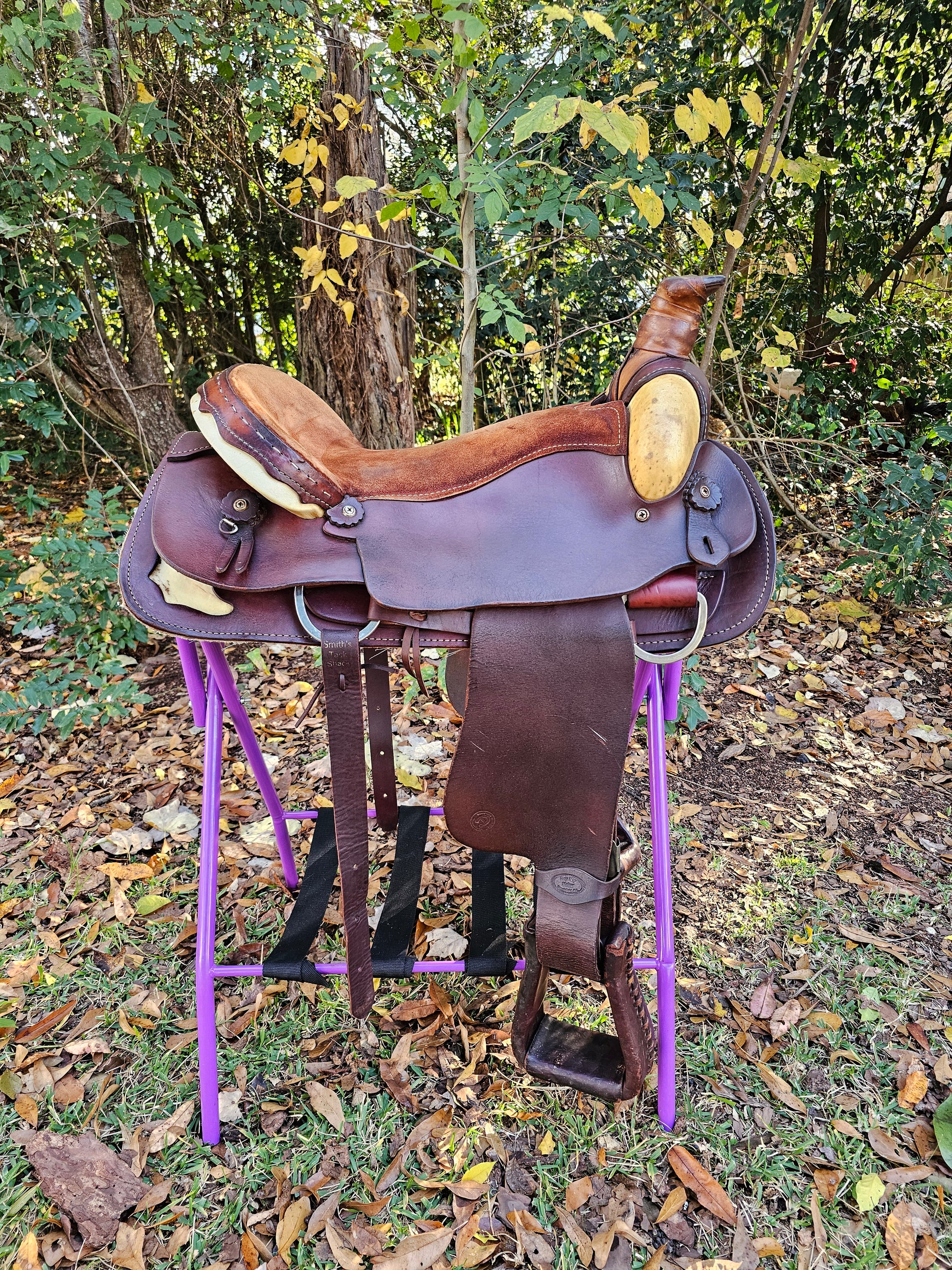 Used 18" Sonny Burt Roping Saddle, 7" gullet FQHB, rawhide accents on pommel, cantle and skirt, beautiful saddle! High Quality leather, built to last! Suede Skirt, new buttery soft off billets, leather wrapped stirrups