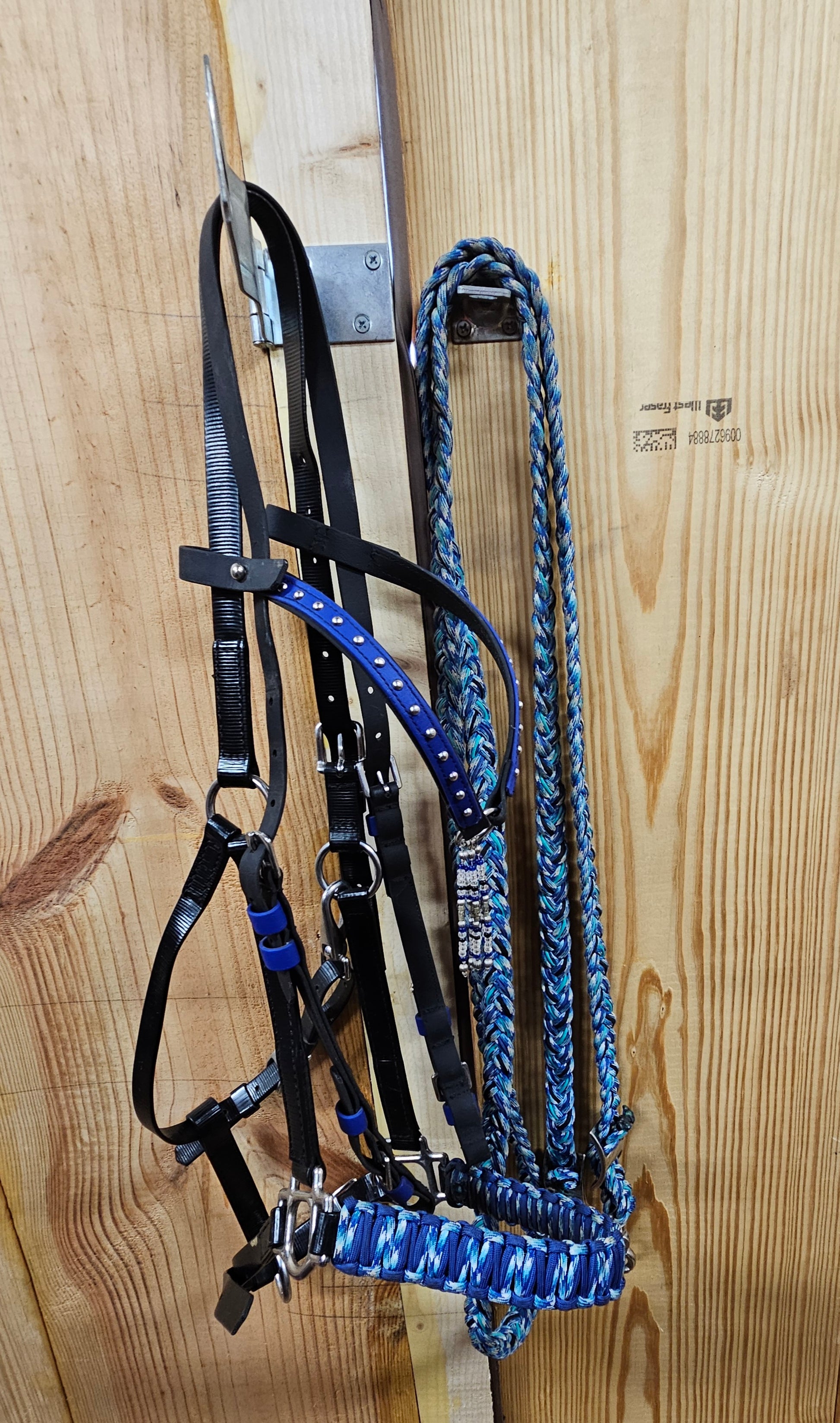 Like new Zilco Beta Biothane Endurance Halter Bridle with mixed blue paracord noseband, throatlatch, Full Size, combine with a clip on headstall, black with royal blue accents, studded browband, buckle ends. Comes with mixed blue braided paracord reins with conway buckles and scissor snaps